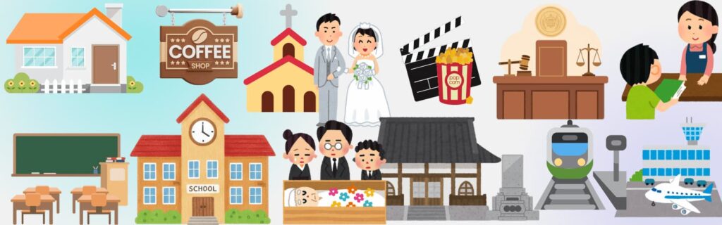 何かを買う、探す、誰かと出会うなどの場面が描かれます。